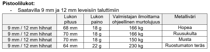 HUOM! Valitessasi tuotteeseesi lukkoa, huomio että lukon tahaton auki kiilautuminen on mahdollista kaikissa muissa lukkotyypeissä, paitsi lukittuvissa alumiinilukoissa; Twistlock ja Screwlock. Lukko voi aueta esimerkiksi tilanteissa, joissa lukko pääsee kiertymään kiinnitysrenkaan ympäri tai tarttumaan kiinni koiran varusteisiin tai maastossa oksiin tms.