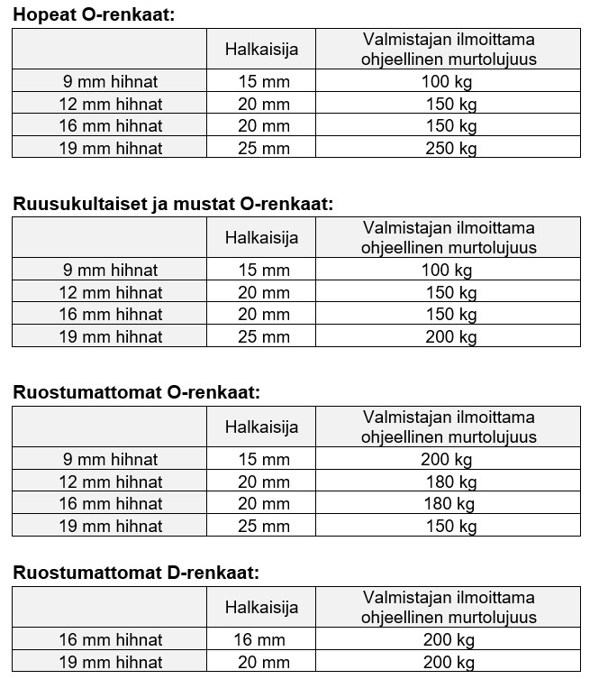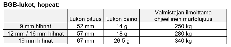 Tarkista lukkojen ja muiden metalliosien murtolujuudet ennen valintaasi. Tarkastele lukkojen ja eri levyisten BioThane-nauhojen kestävyyttä ja suhteuta niitä koirasi painoon ja hihnakäytökseen. Käsityönä valmistetuissa tuotteissa kannattaa tähdätä siihen, että valitsemasi hihnan ja lukon murtolujuus on kymmenkertainen koiran painoon verrattuna, mikäli koiralla on ns. normaali, sievä hihnakäytös. Valitse mieluummin yli- kuin alimitoitettu tuote ja muistathan, että riittävän kestävän ja riittävästi vahvistetun tuotteen valinta on aina koiran omistajan vastuulla.